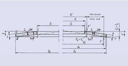 支撐面僅用于厚度大于6mm的碟形彈簧(DIN2093標準,第三組)。采用支撐面使彈簧承載面積增大,從而減少導向件與彈簧之間的摩擦。承載點也由外邊緣de變?yōu)閐e’,由內(nèi)邊緣di變?yōu)閐i’。這種變化導致力臂縮短、載荷特性曲線變陡。如下圖