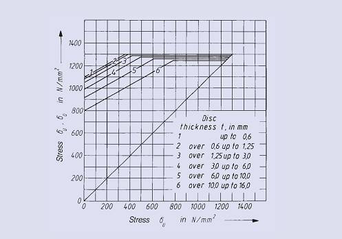 以下所示疲勞強(qiáng)度圖的獲得基于Mubea對碟型彈簧多年的測試結(jié)果。這些結(jié)果中所示為決定碟型彈簧疲勞壽命的下表面許用計(jì)算應(yīng)力。疲勞強(qiáng)度圖也對不同彈簧的尺寸、厚度以及載荷循