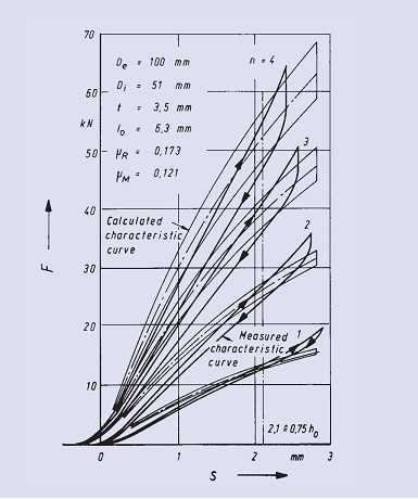 根據(jù)不同的彈簧組合方式,隨碟型彈簧組的壓縮和張開,單個(gè)彈簧之間、彈簧與導(dǎo)向元件之間以及彈簧承載部位的摩擦力都會(huì)升高。因此,對(duì)于給定的彈簧應(yīng)用條件,理論計(jì)算的加載和卸載特曲線都會(huì)與實(shí)際曲線存在偏差。