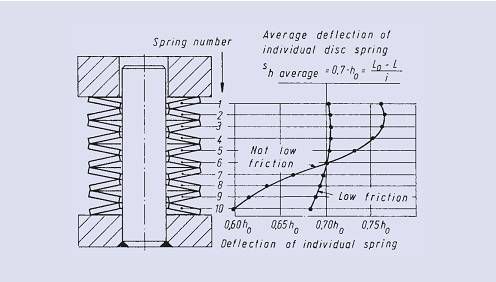 出于安全的原因,即使是由單片彈簧組合的彈簧組也要采用內(nèi)部導(dǎo)向或者外部導(dǎo)向。對(duì)于采用低摩擦設(shè)計(jì)的碟型彈簧組,摩擦力的影響通常忽略不計(jì)。