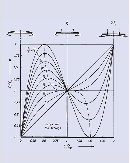 DIN2092標(biāo)準(zhǔn)詳細(xì)闡述了碟型彈簧變形行為的計(jì)算公式,該計(jì)算過(guò)程由ALMEN和LASZLO推導(dǎo)。盡管還有其它一些更為精確的分析等式,但該公式的準(zhǔn)確性足以滿(mǎn)足實(shí)際應(yīng)用的要求。