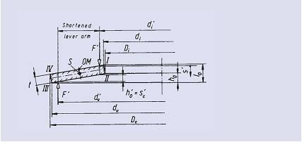 支撐面僅用于厚度大于6mm的碟形彈簧(DIN2093標準,第三組)。采用支撐面使彈簧承載面積增大,從而減少導向件與彈簧之間的摩擦。承載點也由外邊緣de變?yōu)閐e’,由內(nèi)邊緣di變?yōu)閐i’。這種變化導致力臂縮短、載荷特性曲線變陡。如下圖