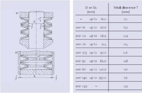對(duì)于內(nèi)外兩種導(dǎo)向方式,彈簧與導(dǎo)向件之間都需要一定的間隙,T,以保證潤滑劑有充分的流動(dòng)空間,從而確保導(dǎo)向正確。根據(jù)盤片內(nèi)徑Di(內(nèi)部導(dǎo)向)和盤片外徑De(外部導(dǎo)向)給出的對(duì)兩種導(dǎo)向方式總間隙T的規(guī)定。