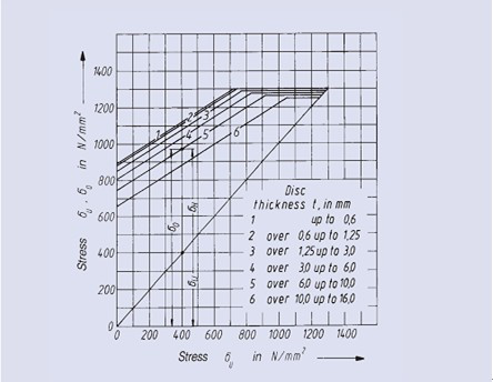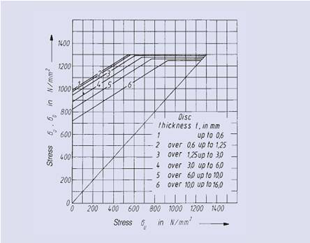 以下所示疲勞強(qiáng)度圖的獲得基于Mubea對碟型彈簧多年的測試結(jié)果。這些結(jié)果中所示為決定碟型彈簧疲勞壽命的下表面許用計(jì)算應(yīng)力。疲勞強(qiáng)度圖也對不同彈簧的尺寸、厚度以及載荷循